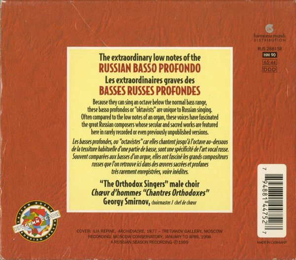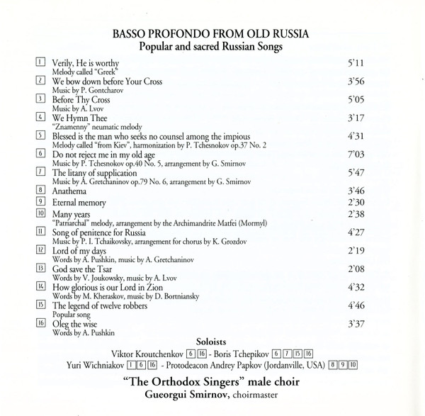 Artist: “The Orthodox Singers” Male Choir* = Chœur D’Hommes “Chantres Orthodoxes”*, Georgy Smirnov – Basso Profondo From Old Russia (Popular And Sacred Russian Songs) = Basses Profondes De L’Ancienne Russie (Chants Russes Populaires Et Religieux)